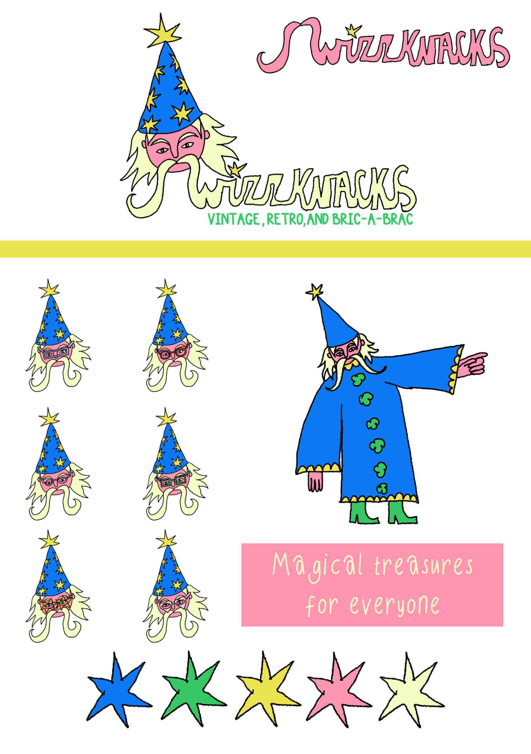 I've always said my dream commissions would be posters and illustrations for Flea Markets, Carboots, Vintage Stores etc. So, I decided to start creating a snazzy imaginary brand 'Wizzknacks' which is a play on wizard and knick-knacks (think magic, fun, energy and secondhand vibes) and make some illustrated content for this brand so that real-world clients in this area can see what I could create for them (and hopefully reach out to work together)!I had so much fun working on this mini project! A lot of my creative inspiration comes from spending time hunting for secondhand treasures, in all sorts of shops and events.