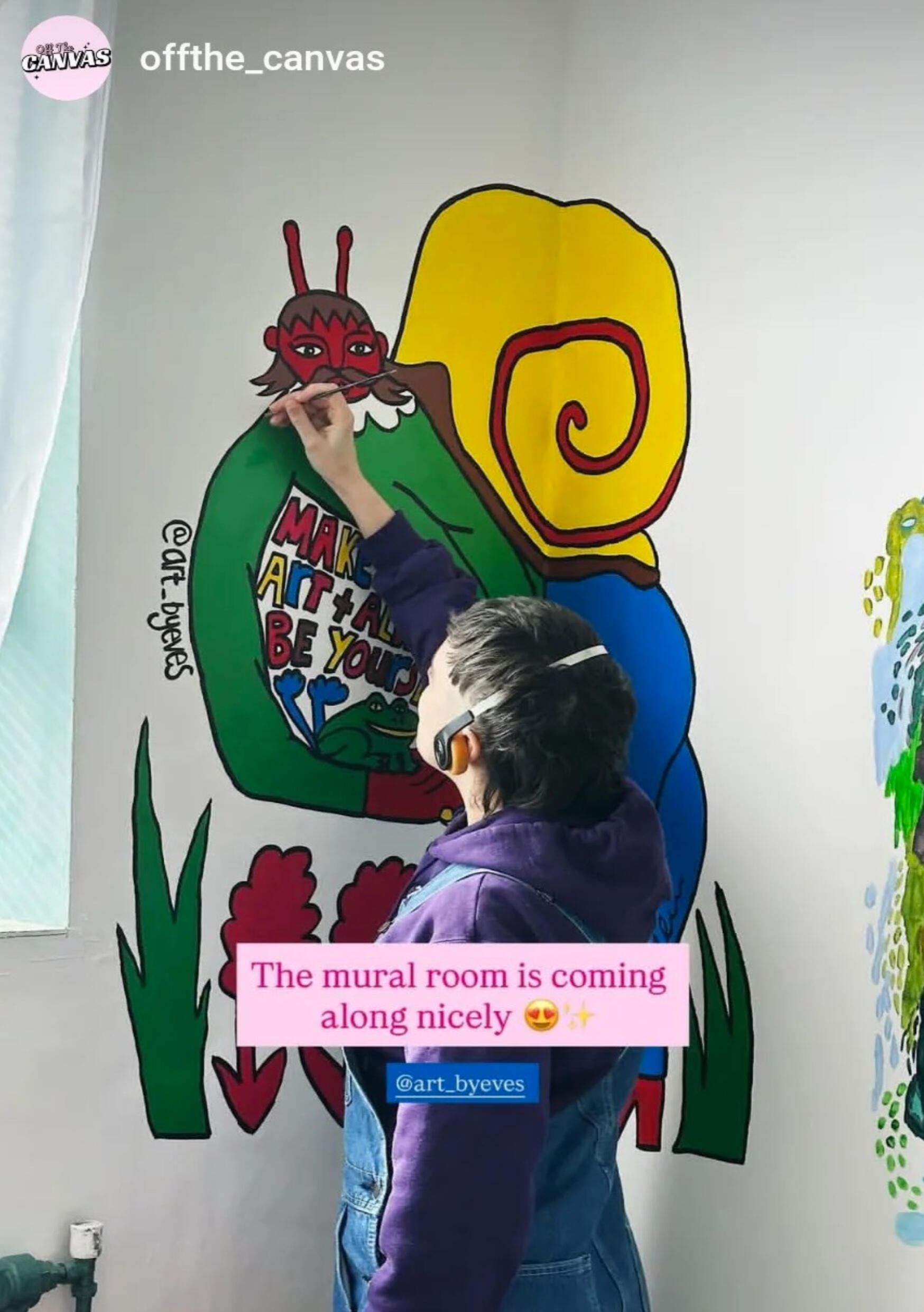 Off The Canvas Cafe in central Sheffield reached out and invited me to add my mark to their community mural room. This was my first attempt at a wall mural, and I loved it! I've had some epic feedback since finishing and loved the process of planning through to finishing my mural!There was no specific brief for this piece, but I wanted to showcase my style and some wonky, fun characters. My process began by thinking about the composition and layout, creating a digital sketch and then going for it on the wall- learning as I went along. Murals are something that I've wanted to get into for a while and I'm super excited to do more!